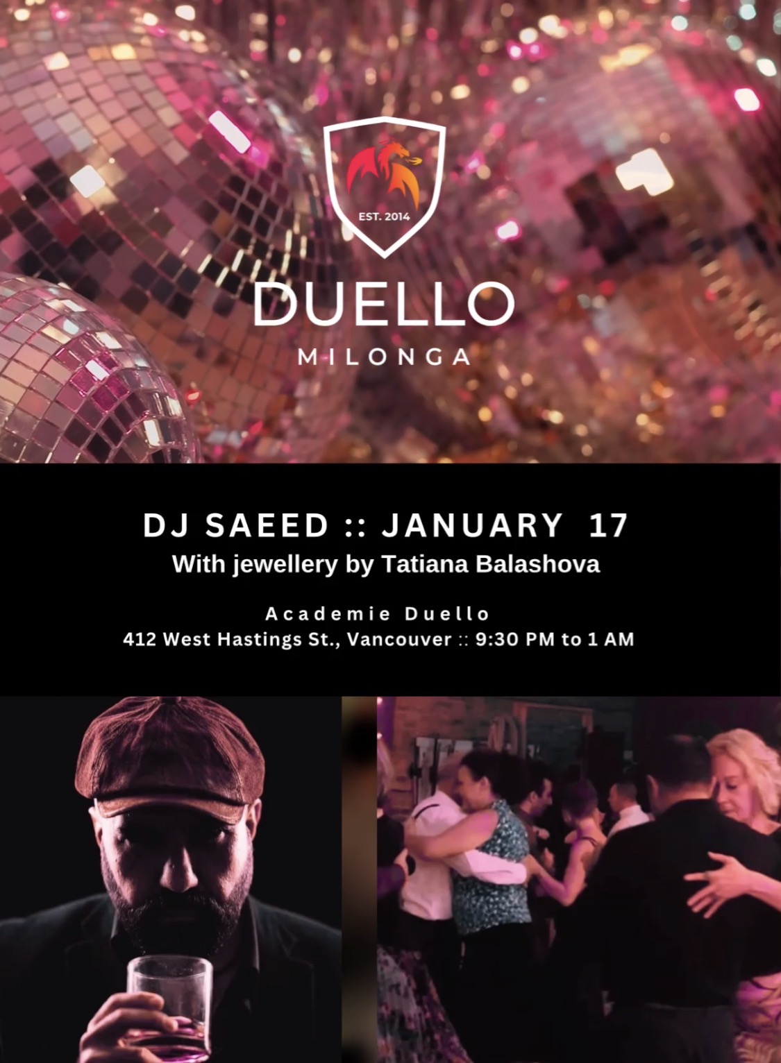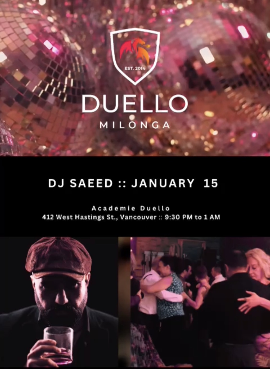 Dance the night away with music from the golden ages of tango. The Duello Milonga is held every 3rd & 5th Saturday at Academie Duello, 412 West Hastings St., Vancouver BC.