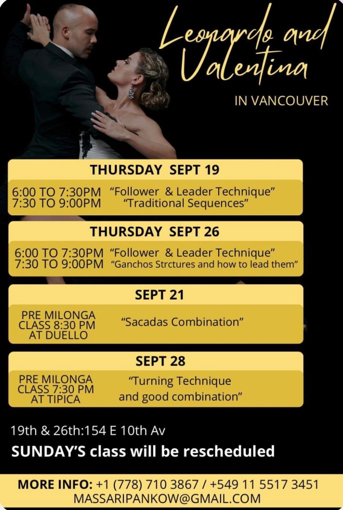 Join Leonardo and Valentina, acclaimed Argentine Tango teachers from Argentina, for a series of classes in Vancouver this fall. This series will enhance your skills with a focus on connection, musicality, and authentic Argentine Tango.